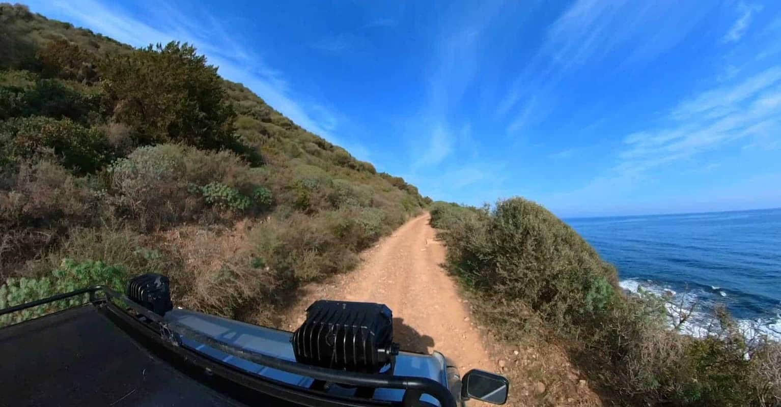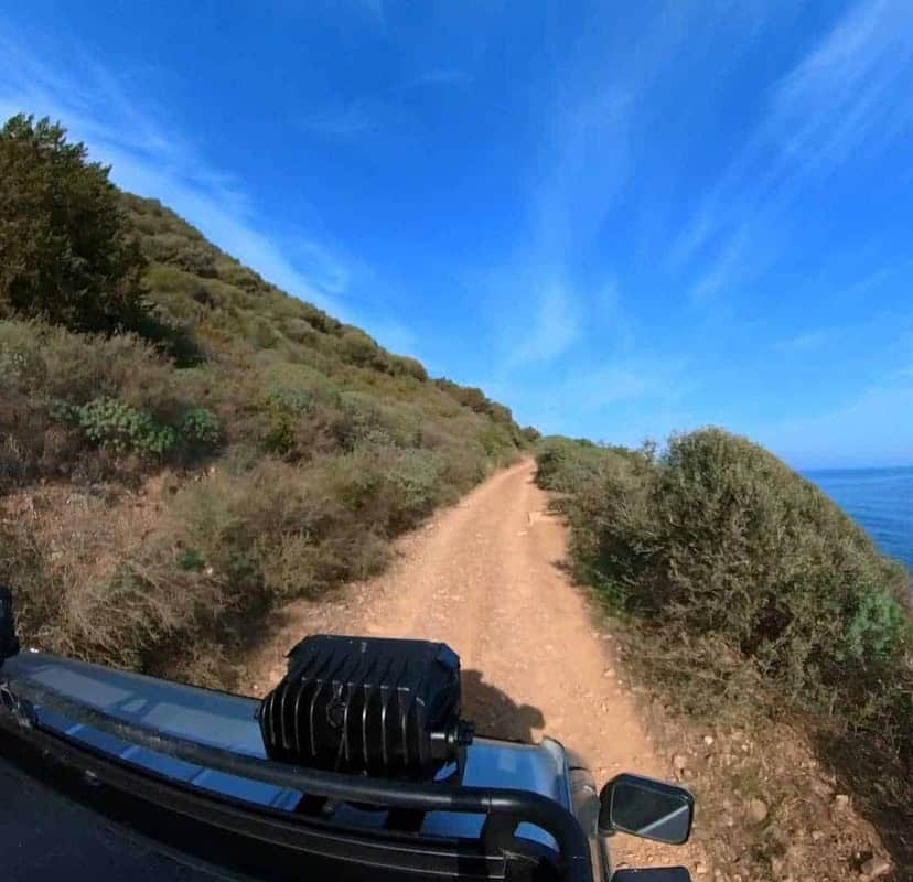 Der Weg zur Caletta S’abba ‚e s’Ulimu ist ein Abenteuer für sich. Der Trail führt über steinige, unbefestigte Wege, die sich durch die rauen Hügel der sardischen Küste schlängeln. Abschnitte mit losem Geröll, steilen Anstiegen und engen Kurven machen die Strecke zu einer Herausforderung, die jedoch mit einem Allradfahrzeug und ausreichend Bodenfreiheit gut zu bewältigen ist.