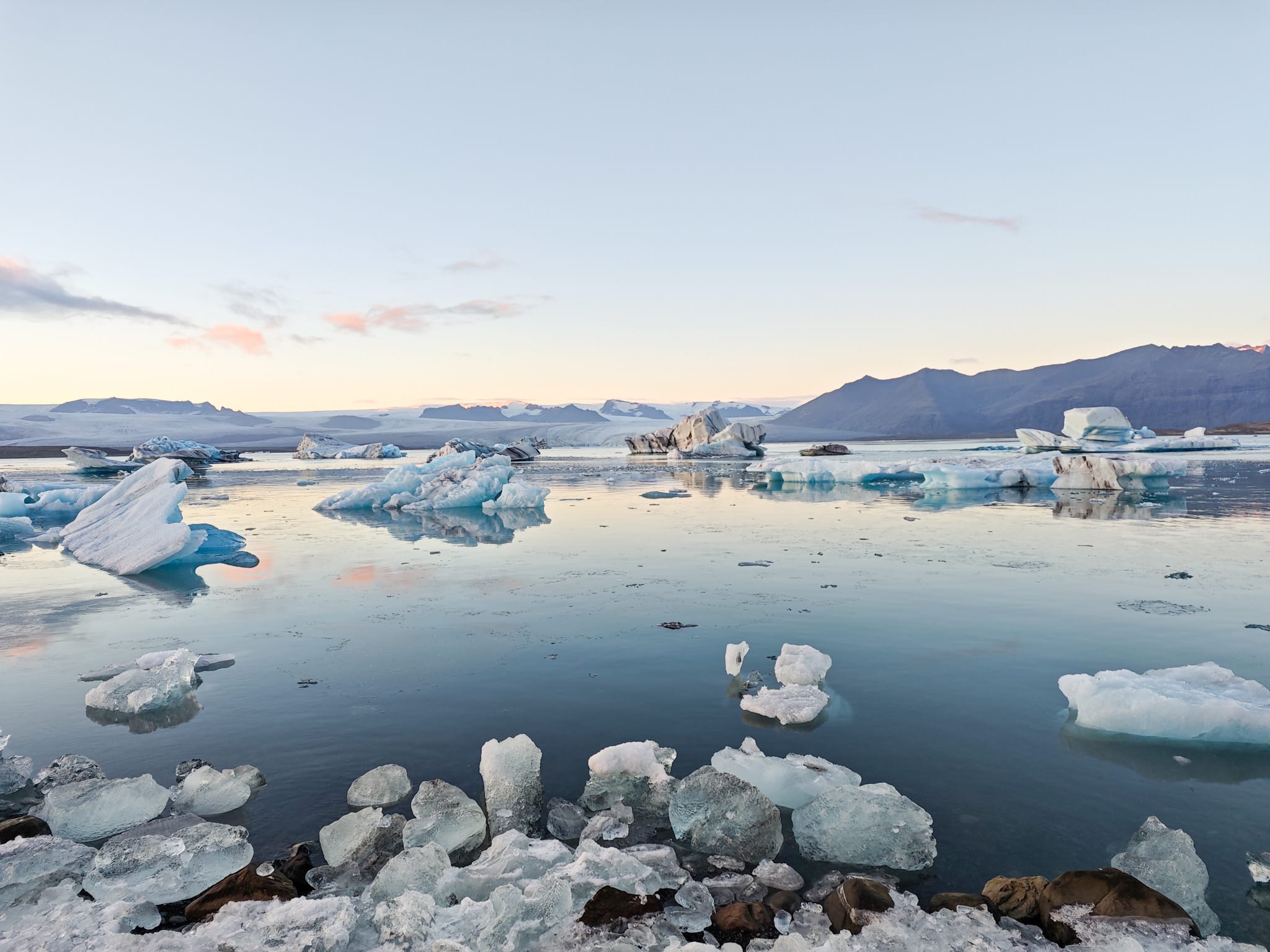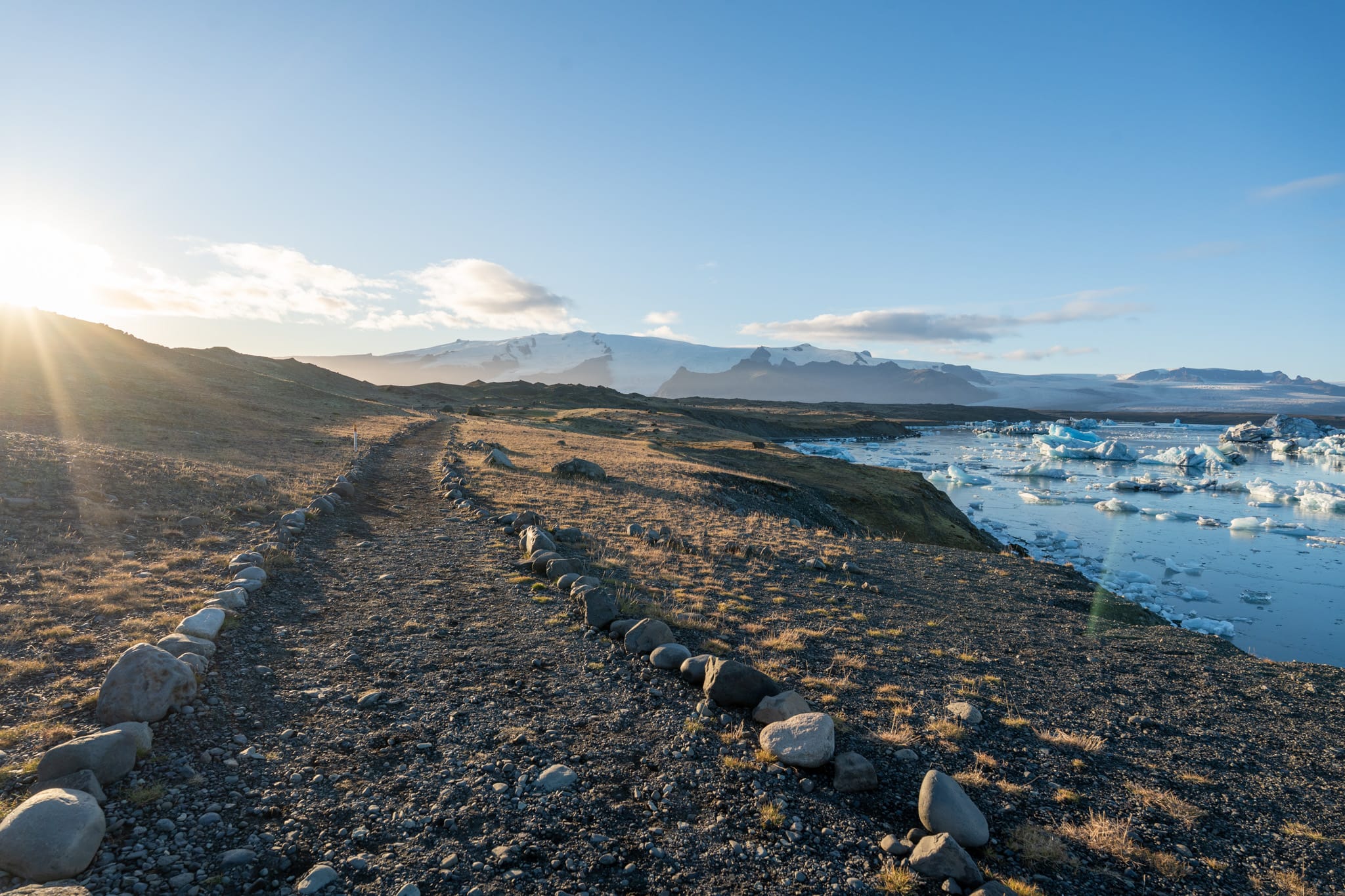 Wer hier nicht nur kurz anhält, kann die Gletscherlagune gut zu Fuß erkunden und ein Stück am Ufer entlanglaufen. Besonders bei tief stehender Sonne wirkt die Landschaft noch einmal ganz anders, auch wenn es zu dieser Zeit deutlich voller wird – vor allem am Diamond Beach. Statt eines schnellen Fotostopps lohnt es sich daher, etwas mehr Zeit einzuplanen und die Umgebung zu Fuß auf sich wirken zu lassen. Mit etwas Glück lassen sich dabei auch Robben in der Lagune beobachten, teils direkt vom Ufer aus.