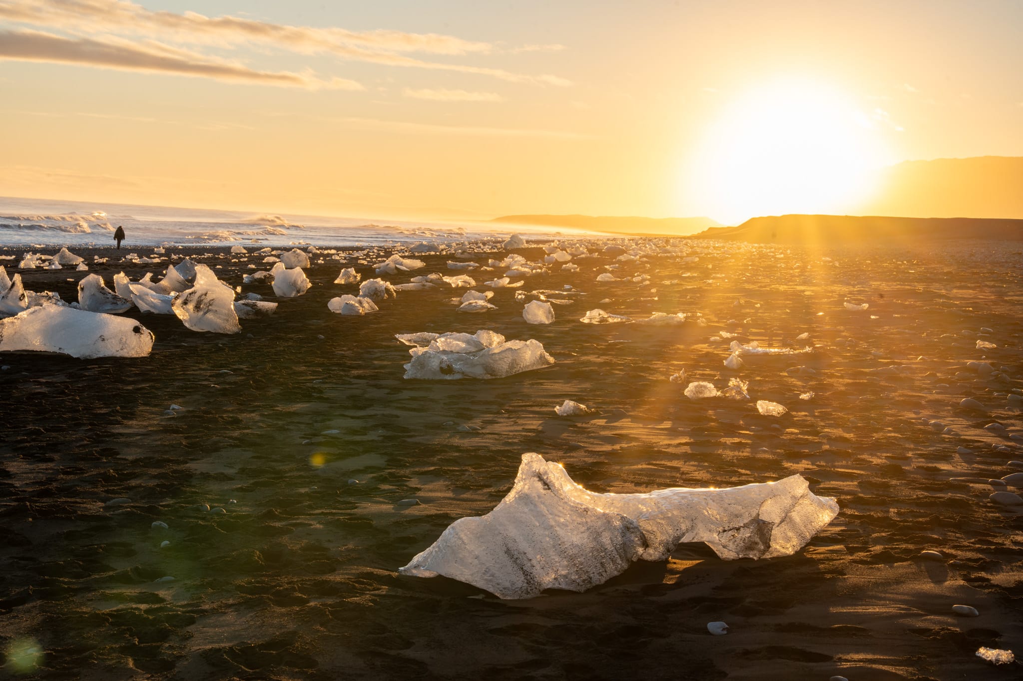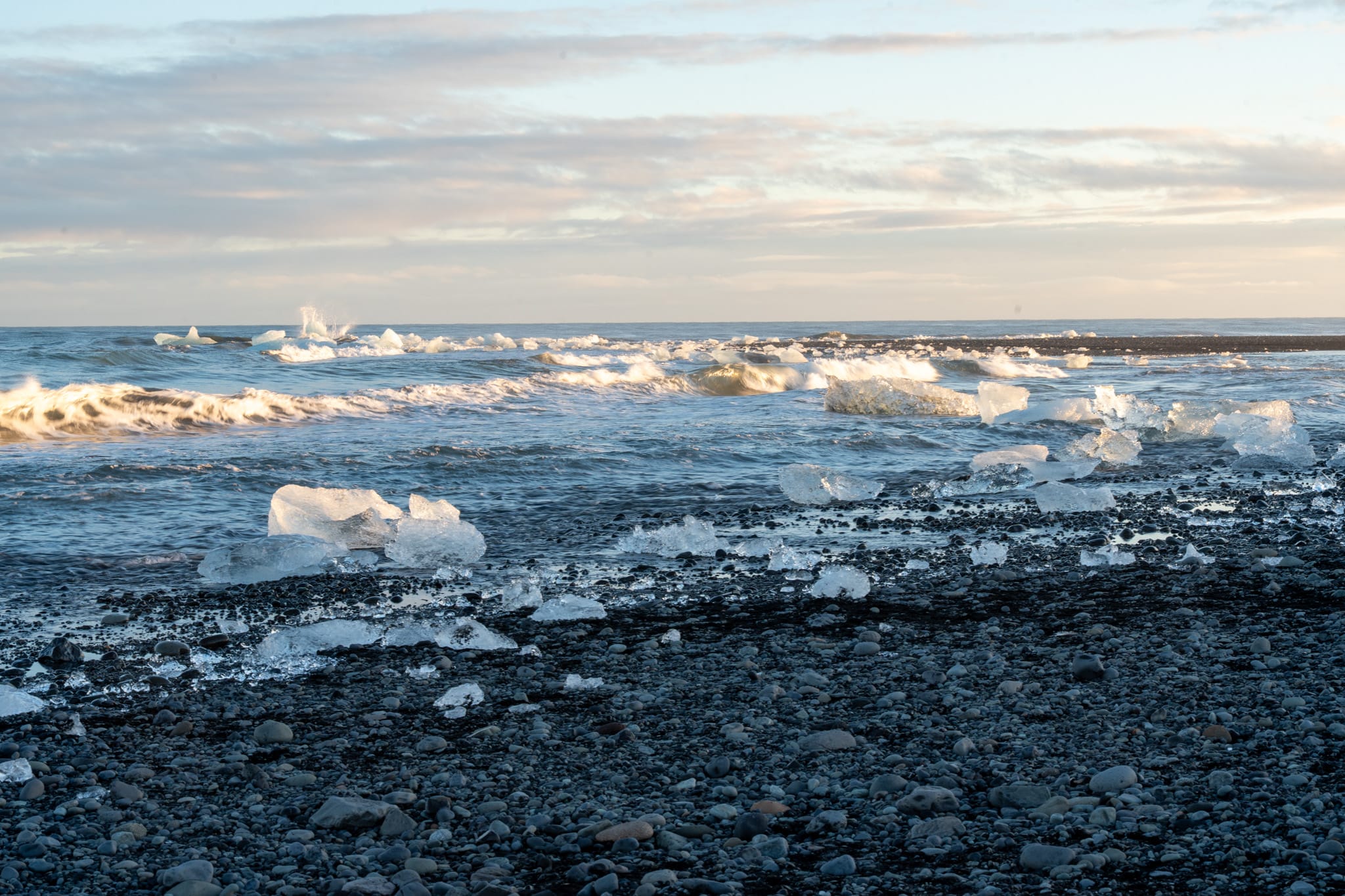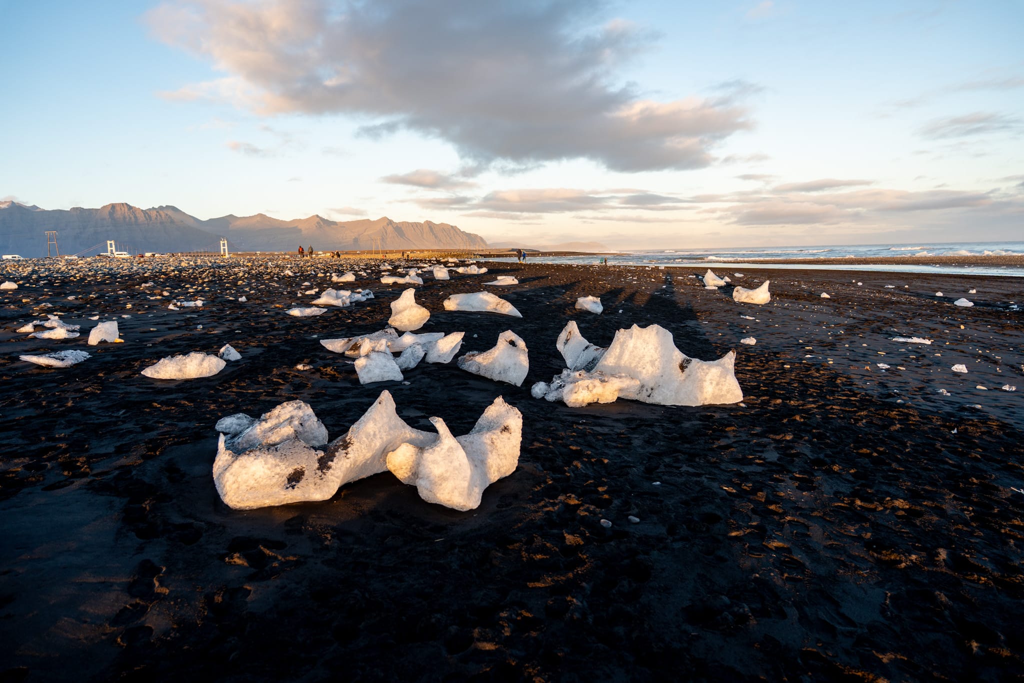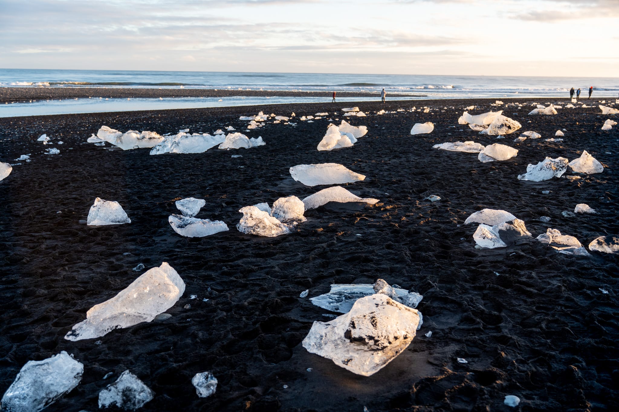 Auf dem tiefschwarzen Vulkansand wirken die Eisstücke besonders kontrastreich. Manche sind nur handgroß, andere mehrere Meter lang. Je nach Licht schimmern sie klar, milchig weiß oder tiefblau und erinnern an Diamanten auf schwarzem Sand. Gerade diese kleinen, unregelmäßigen Eisbrocken machen den Reiz des Strandes aus, da sie sich ständig verändern – was heute noch liegt, kann morgen schon verschwunden sein.
