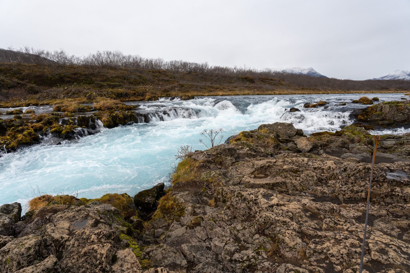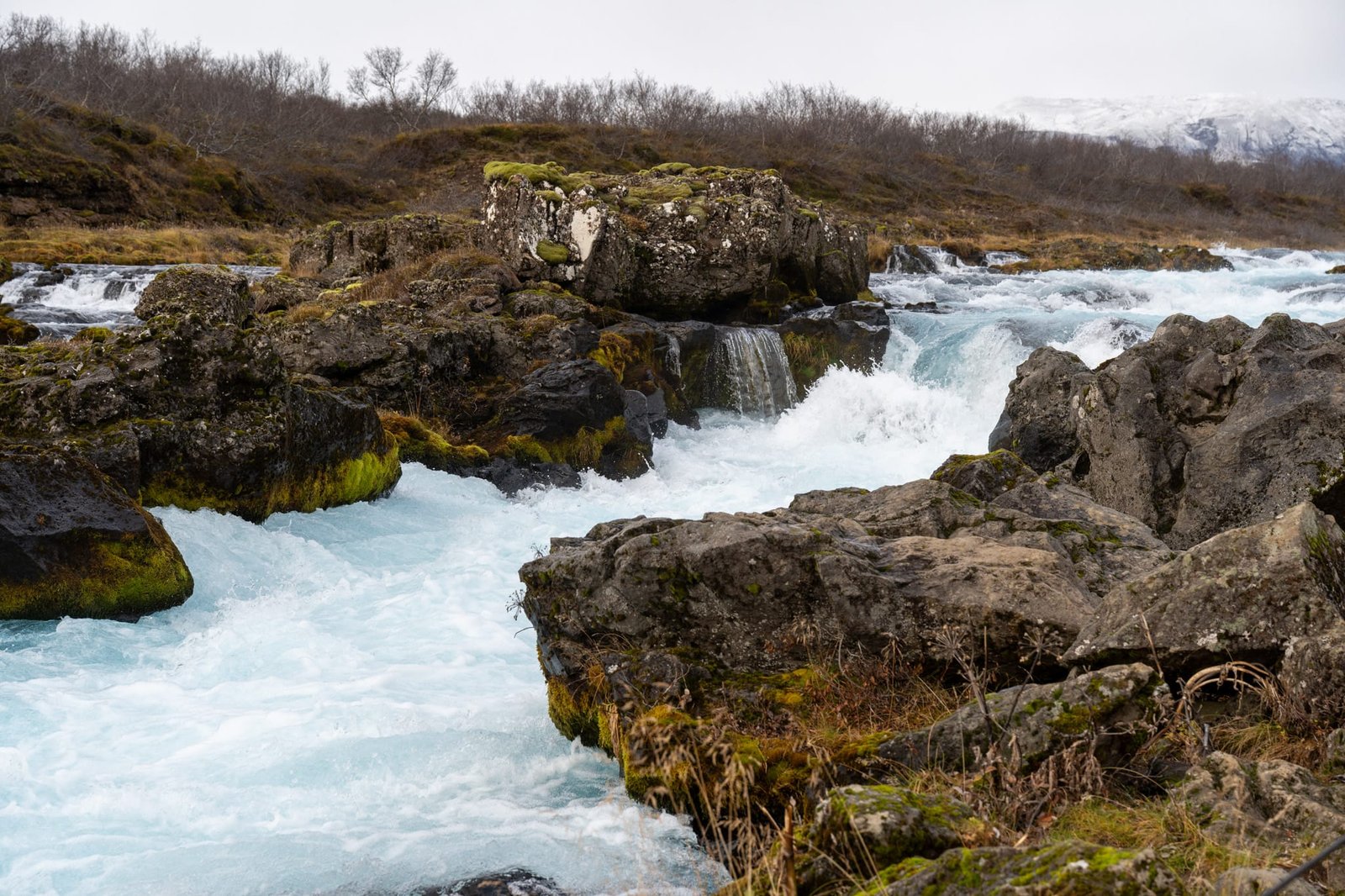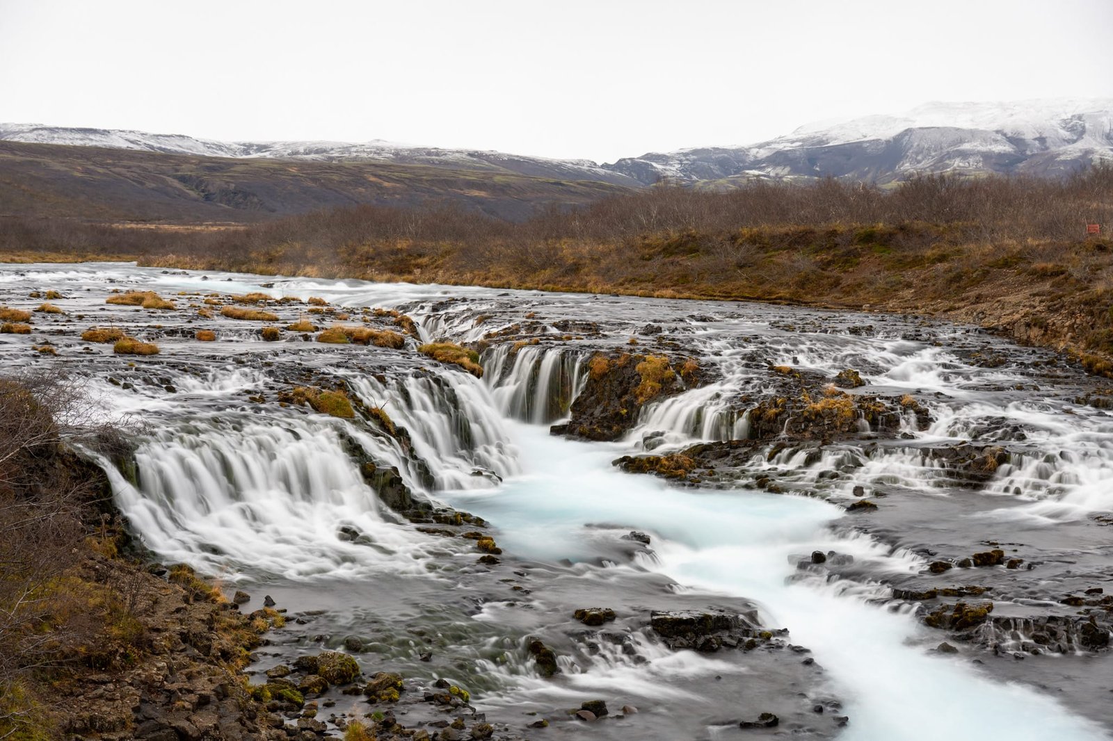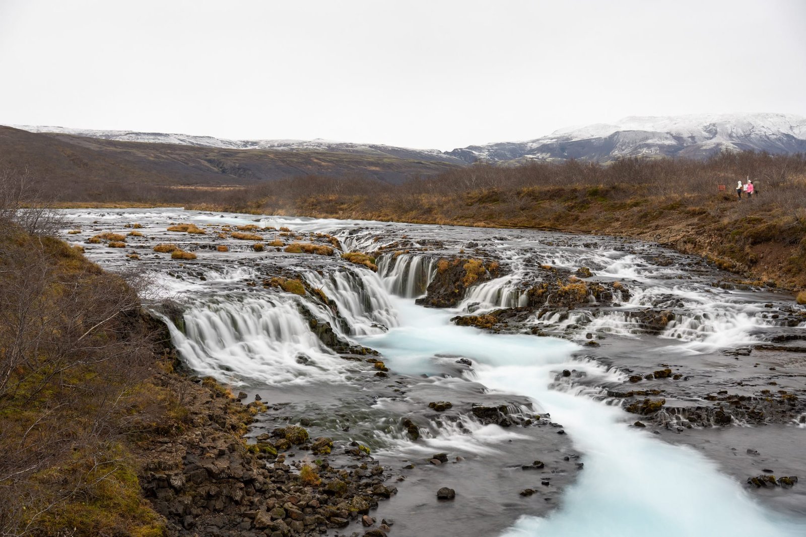 Der Wasserfall ist kein klassischer, hoher Fall, sondern besteht aus mehreren kleinen Kaskaden, die sich über dunkle Felsen verteilen. Gerade diese Form macht den Brúarfoss sehr fotogen. Von der kleinen Brücke über den Fluss hast du einen guten Blick auf den Wasserfall und die leuchtend blaue Strömung.
