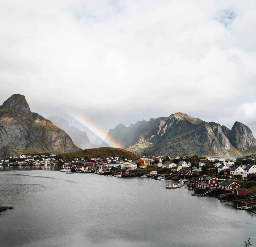 Reine selbst liegt malerisch an einer Bucht, umgeben von steil aufragenden Bergen und tiefblauen Fjorden. Vom Gipfel des Reinebringen kannst du das gesamte Dorf überblicken, das sich mit seinen bunten Holzhäusern entlang der Küste erstreckt. Besonders beeindruckend ist der Blick bei Sonnenaufgang oder Sonnenuntergang, wenn das Licht die Landschaft in warme Farben taucht und die Berge und das Meer in einem goldenen Schimmer erstrahlen. Der Anblick ist so atemberaubend, dass er oft als einer der schönsten in ganz Norwegen gilt.