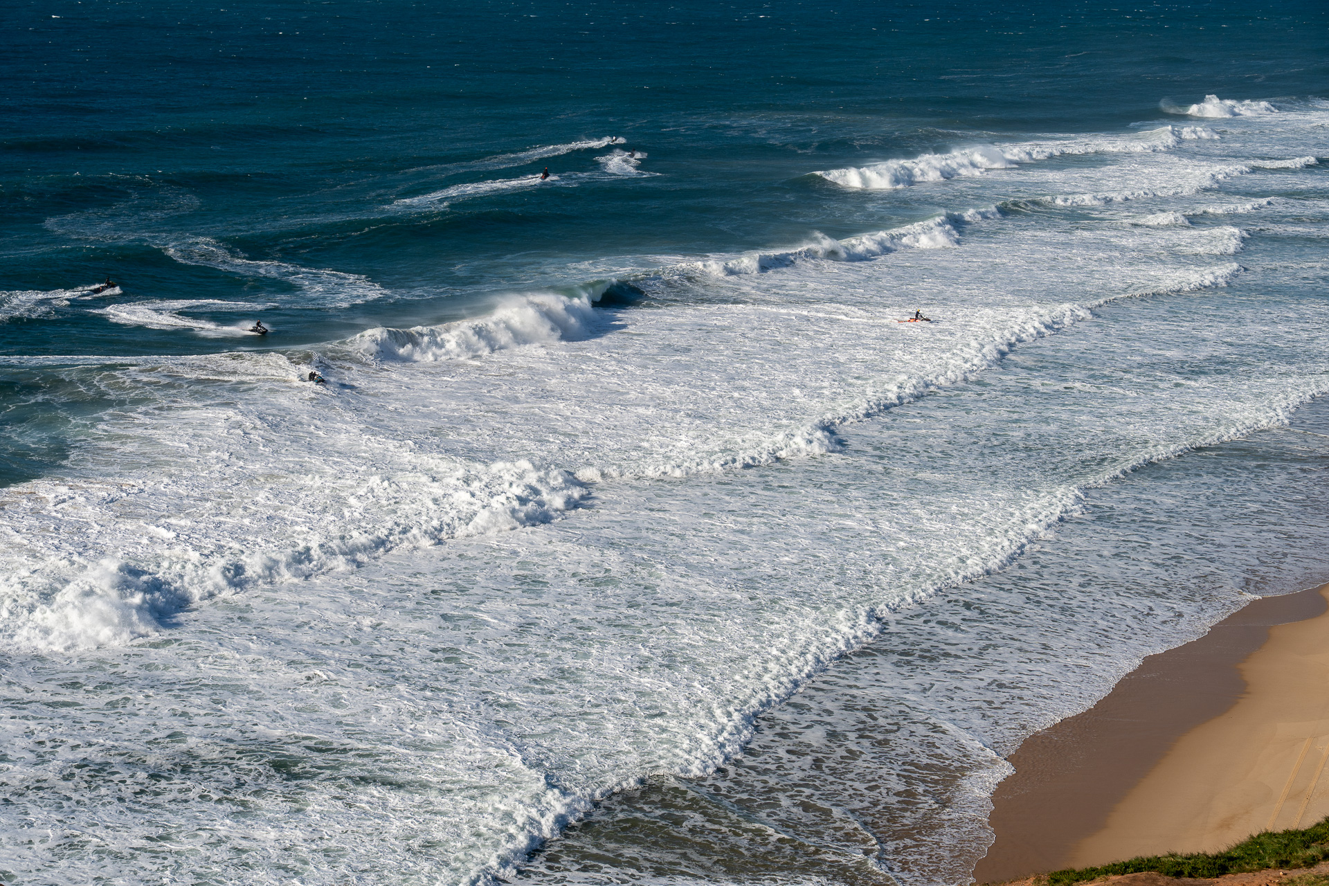 Nur wenige Minuten nördlich liegt der Praia do Norte, einer der bekanntesten Strände der Welt. Durch den Unterwassercanyon von Nazaré entstehen hier im Herbst und Winter die größten Wellen des Atlantiks. Zwischen November und Februar erreichen sie Höhen von 20 bis über 30 Metern – die höchsten, die je gesurft wurden.