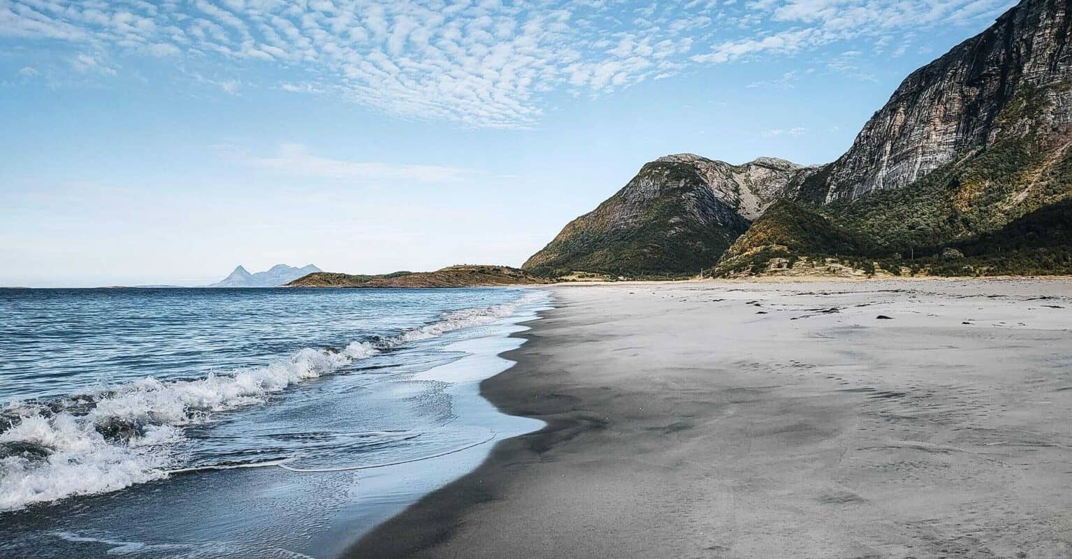 Sandhornøya, eine idyllische Insel in der Region Gildeskål in Nordnorwegen, ist ein Geheimtipp für Naturliebhaber und Ruhesuchende, die die wilde, unberührte Landschaft der norwegischen Küste in vollen Zügen genießen möchten. Nur etwa 100 Kilometer südlich von Bodø gelegen, vereint Sandhornøya einige der schönsten Naturschätze Nordnorwegens. Die Insel bietet weite Sandstrände, dramatische Berge und klare, türkisfarbene Gewässer – eine außergewöhnliche Kombination, die für die Region eher selten ist und die Insel zu einem einzigartigen Reiseziel macht. Der Sandstrand Langsanden, einer der beeindruckendsten Strände Nordnorwegens, erstreckt sich hier über mehrere Kilometer und sorgt mit seinem feinen Sand und der friedlichen Atmosphäre für ein besonderes Naturerlebnis, das du auf deiner Reise durch Norwegen nicht verpassen solltest.