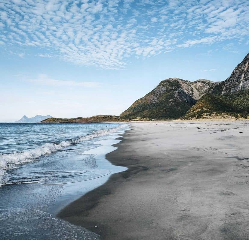 Langsanden ist ein malerischer Sandstrand, der sich etwa zwei Kilometer entlang der Westküste von Sandhornøya erstreckt und durch seine außergewöhnliche Schönheit besticht. Der feine, helle Sand und das klare, türkisfarbene Wasser verleihen Langsanden eine fast karibische Anmutung, doch statt tropischer Palmen umrahmen schroffe Berge und die Weite des Atlantiks diese Küstenperle. Hier findest Du eine natürliche Kulisse, die durch ihre Schlichtheit und Weite beeindruckt und jeden Besucher sofort in die beruhigende Stimmung der nordischen Küste eintauchen lässt.