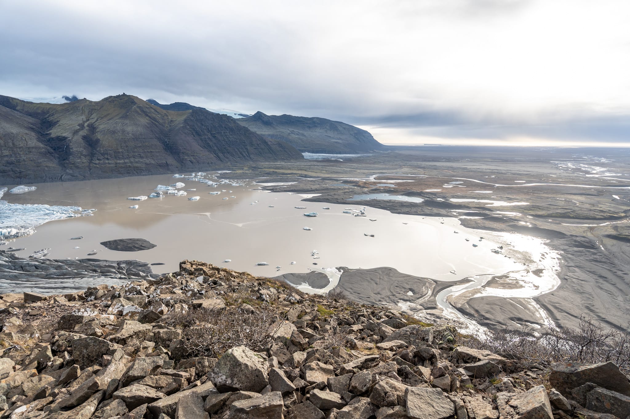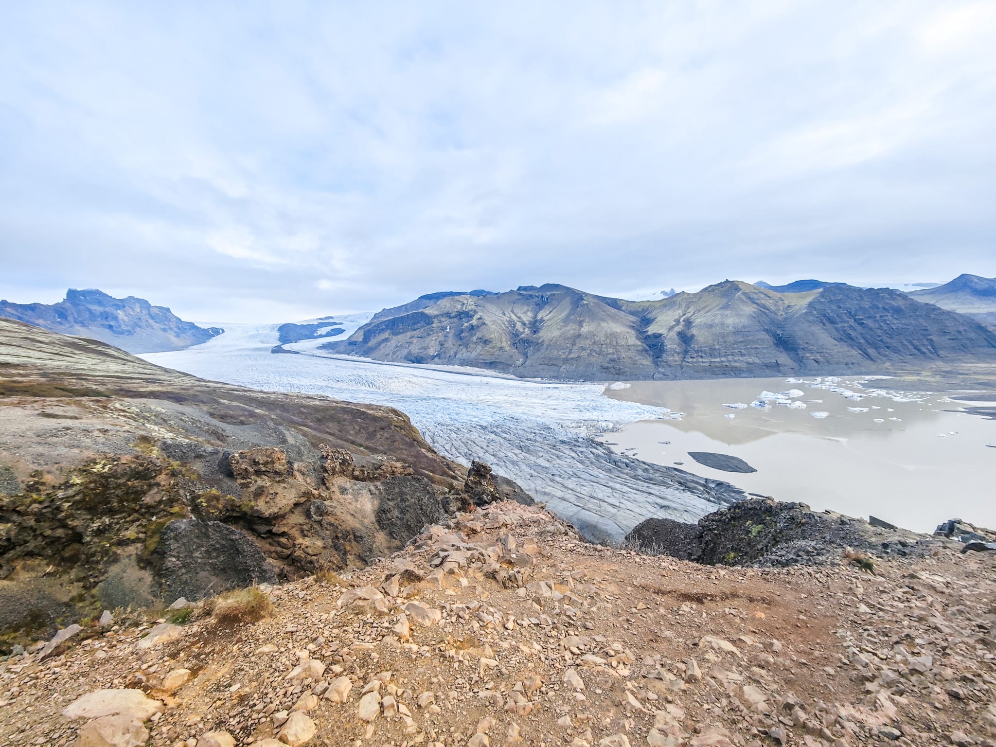 Entlang der Wanderwege gibt es mehrere Aussichtspunkte mit Blick auf die Gletscherzunge. Von hier zeigt sich der Kontrast zwischen Eis, dunklem Gestein und den Ebenen der Gletscherflüsse besonders klar. Je nach Jahreszeit treiben kleinere Eisberge in den Lagunen vor dem Gletscher.