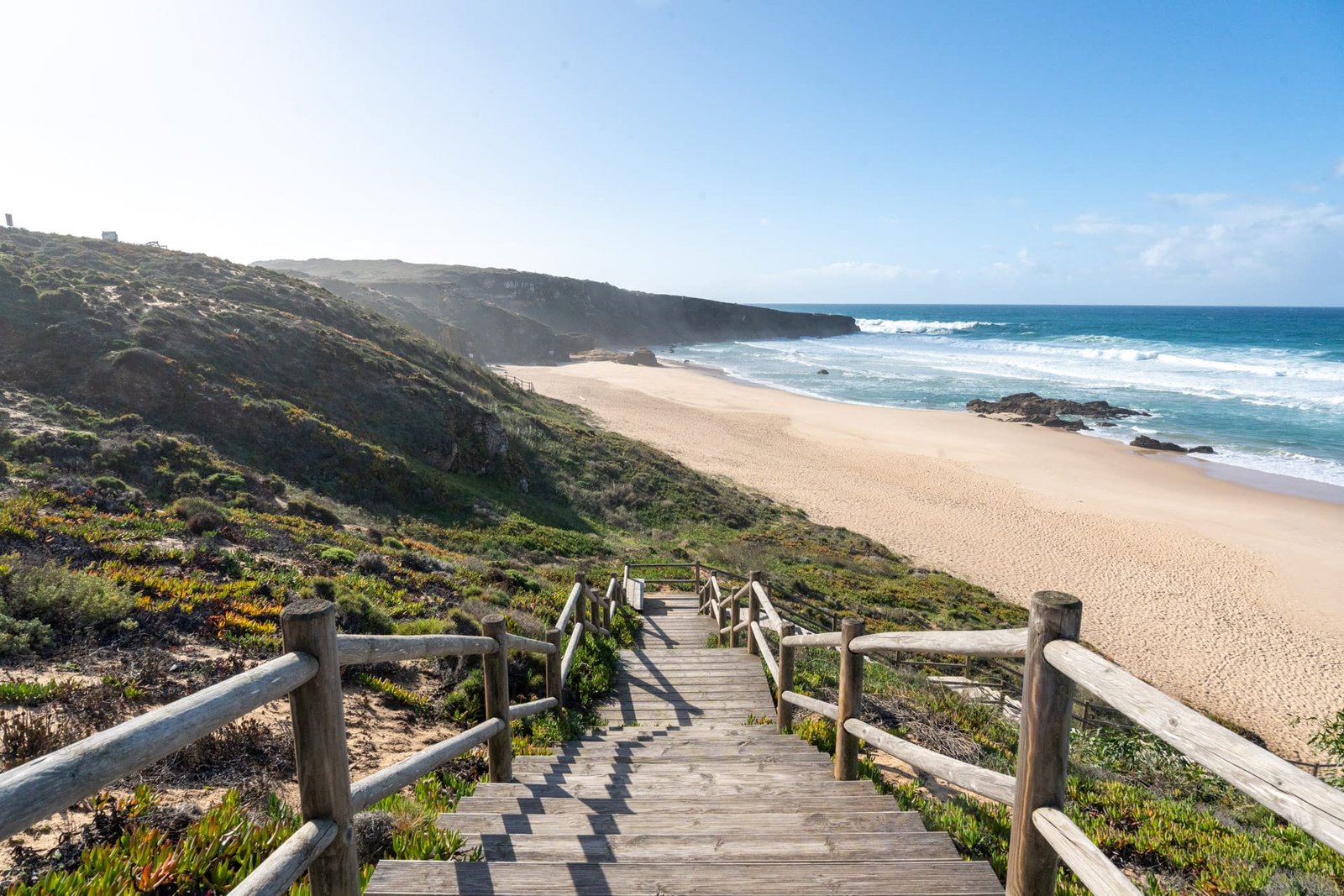 Der Strand ist besonders beliebt bei Surfern, aber auch für Spaziergänge eignet er sich hervorragend. Mehrere kleine Holzstege führen von den Parkplätzen über die Dünen bis hinunter ans Wasser. Gerade in der Nebensaison hast du den Praia do Malhão fast für dich allein – ideal, um die Ruhe zu genießen.