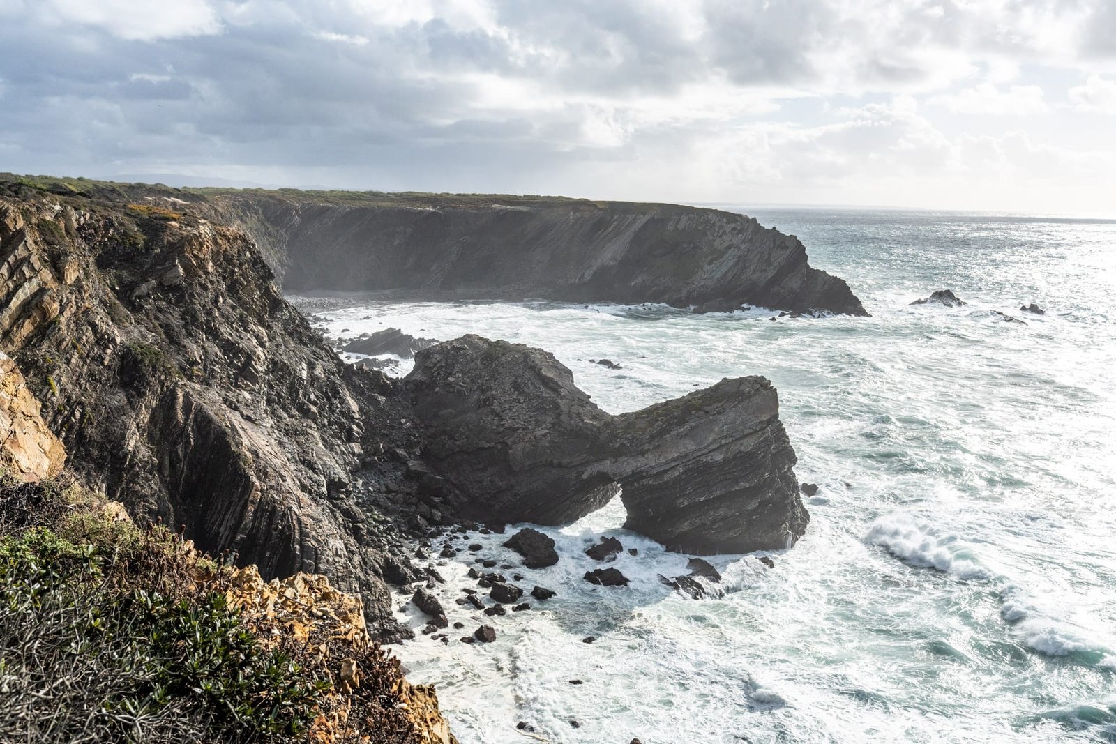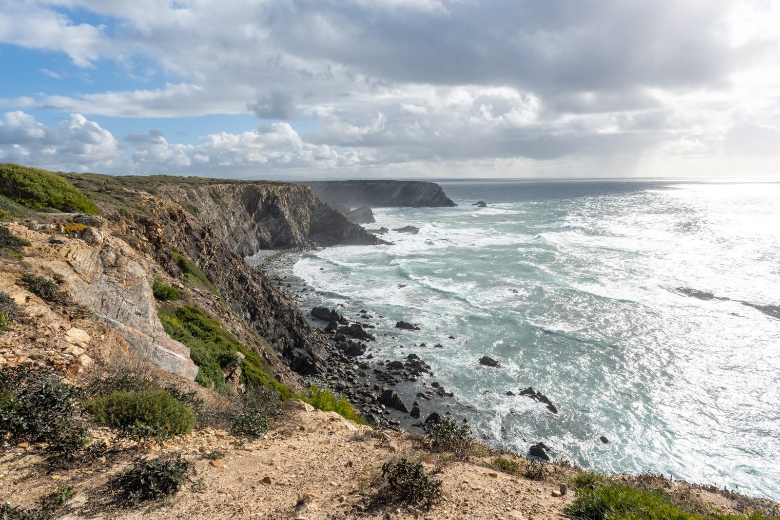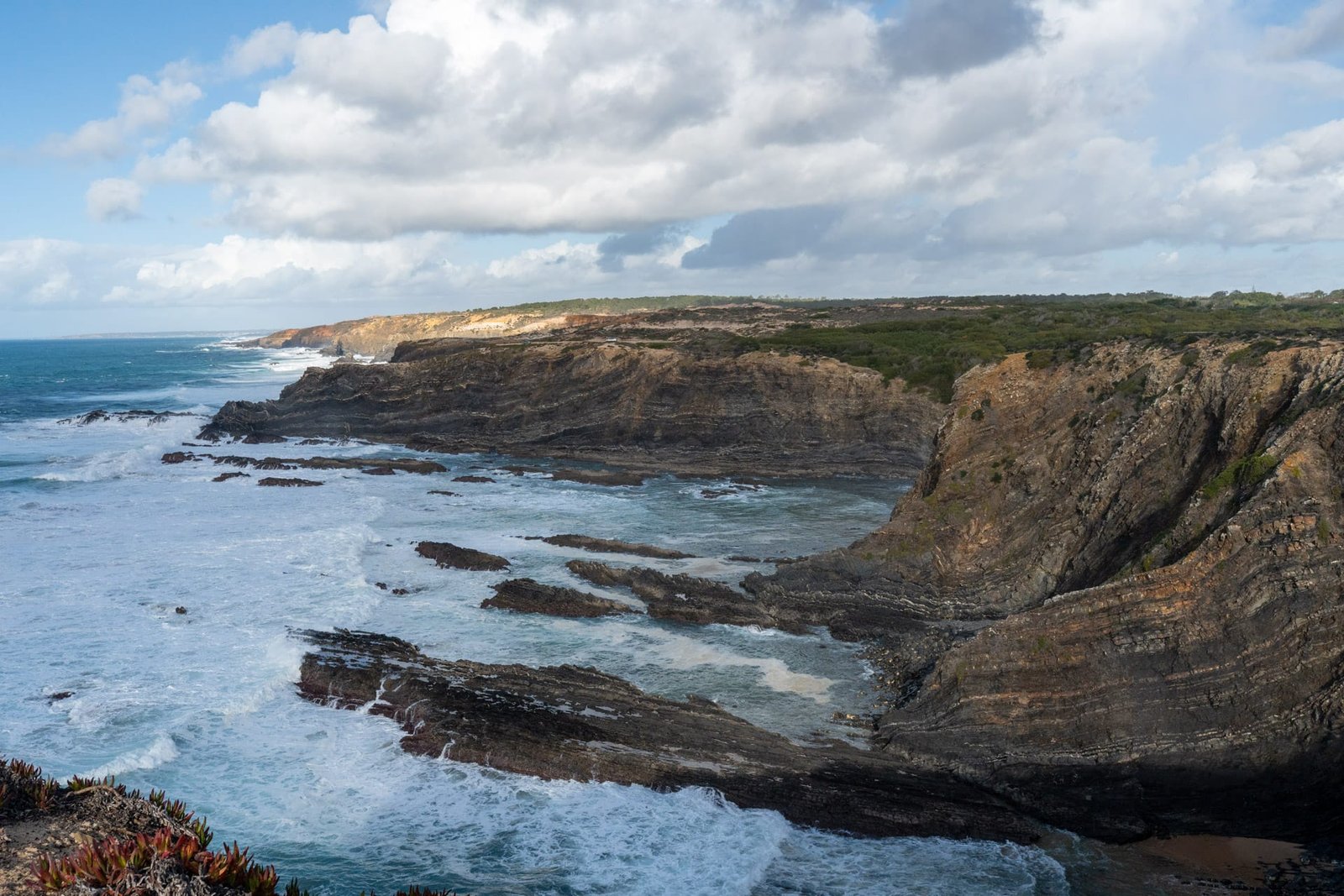 Von Odeceixe aus führt ein Abschnitt des Trilho dos Pescadores an diesem Teil der Küste entlang. Der Wanderweg folgt schmalen Pfaden über Klippen, durch Blumenwiesen und vorbei an einsamen Buchten. Die Kombination aus Wind, Wellen und dem offenen Blick aufs Meer macht diesen Abschnitt besonders eindrucksvoll.