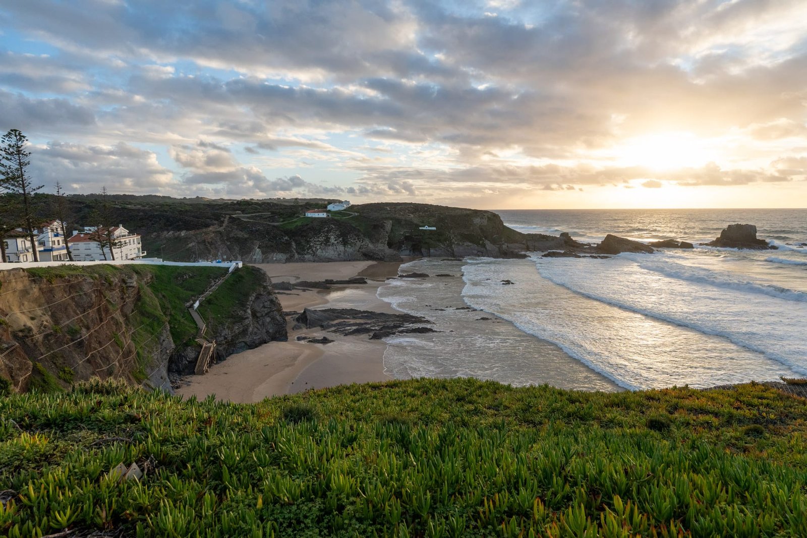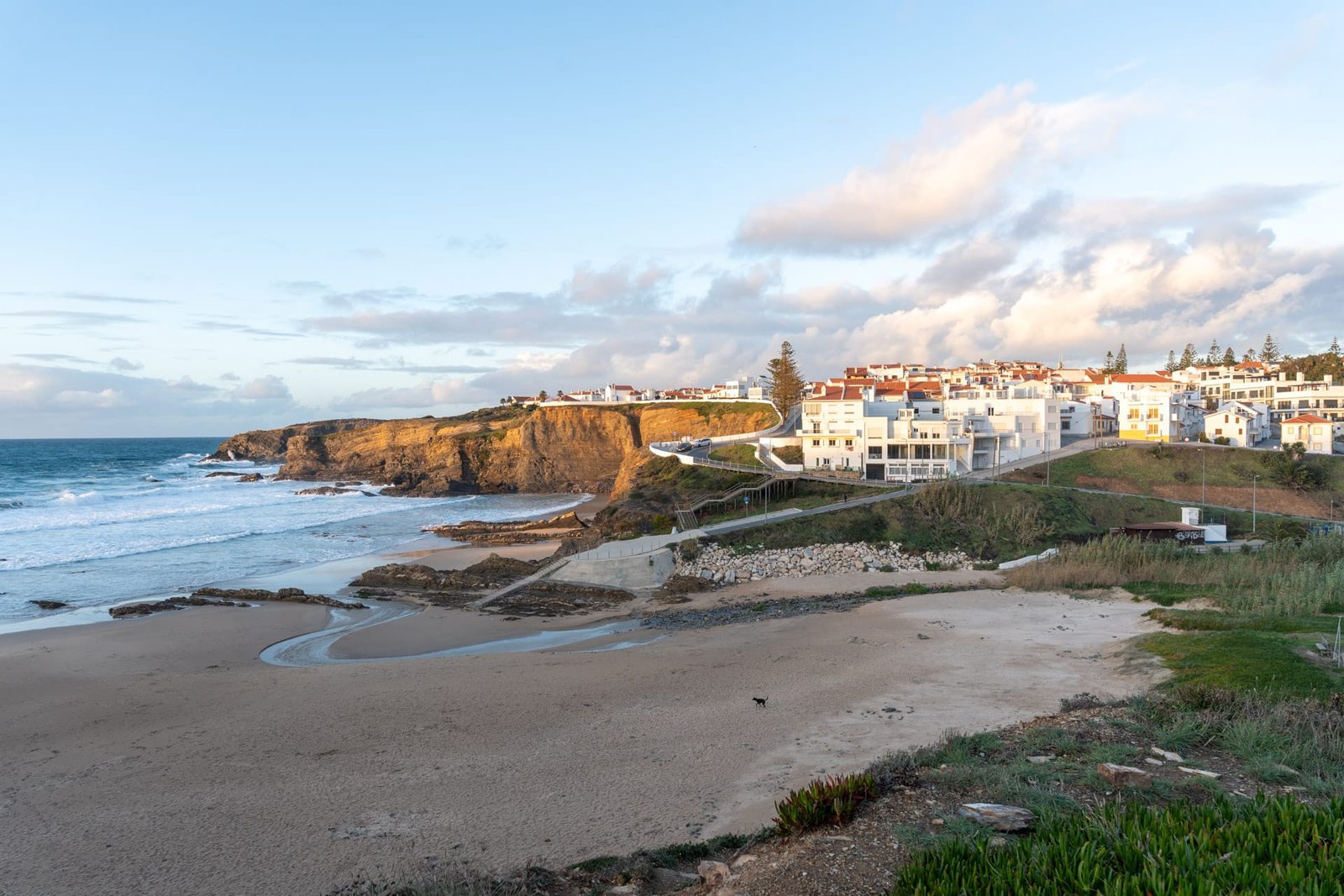 Der Küstenweg Trilho dos Pescadores führt hier mitten durch den Ort, sodass sich Zambujeira gut als Zwischenstopp auf einer Wanderung oder Etappe mit dem Auto anbietet. Besonders schön ist der Blick von den Klippen bei Sonnenuntergang, wenn die Häuser im warmen Licht leuchten und die Wellen unten am Strand brechen.