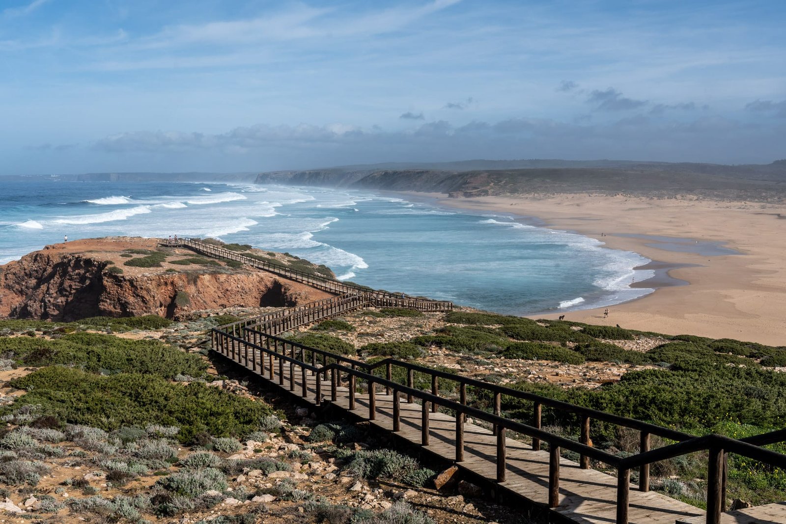 Vom Parkplatz oberhalb von den Sandstränden führen Holzstege zu verschiedenen Aussichtspunkten. Besonders eindrucksvoll ist der Blick von den Klippen südlich des Strandes: Von hier siehst du die Weite des Strandes, die Dünenlandschaft und das Meer gleichzeitig.