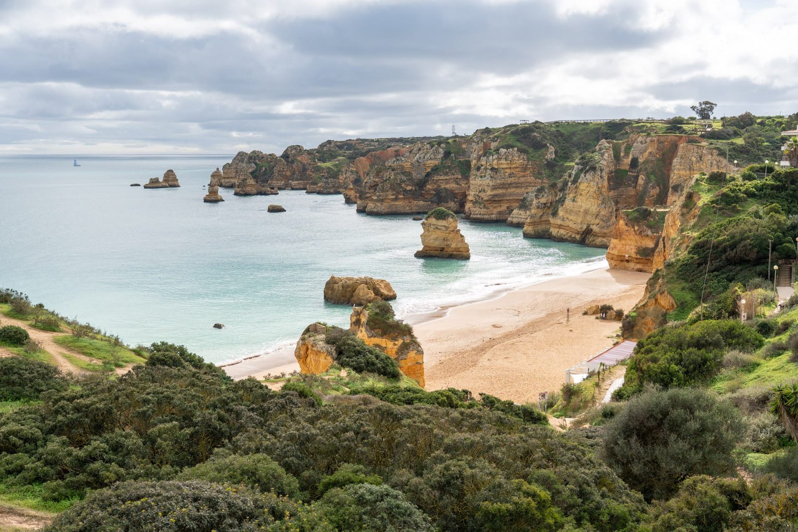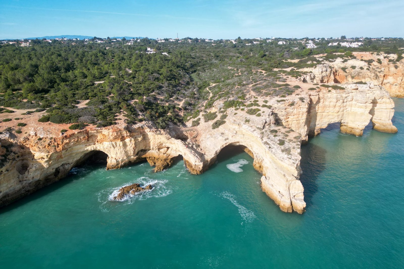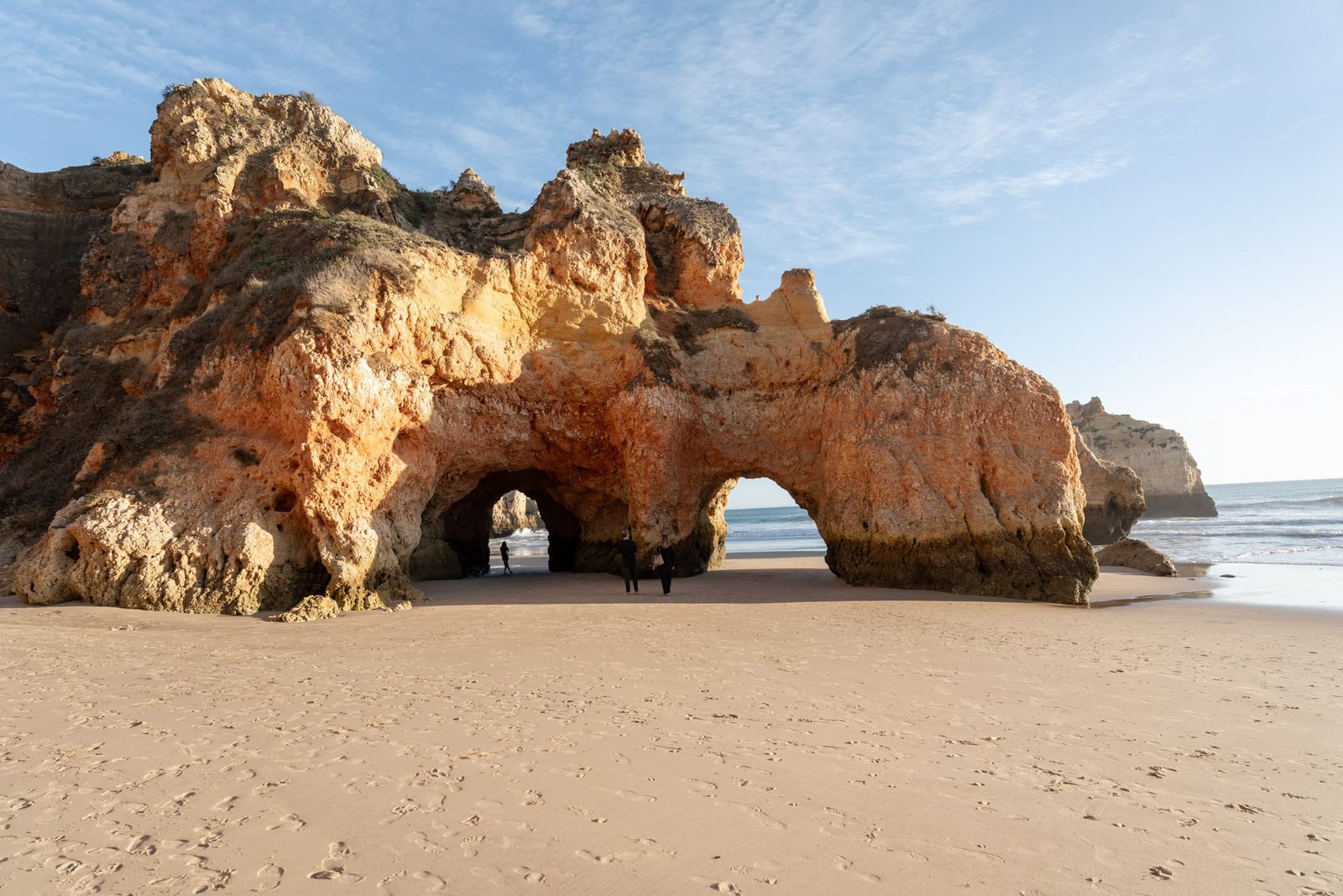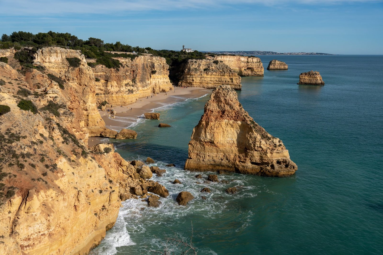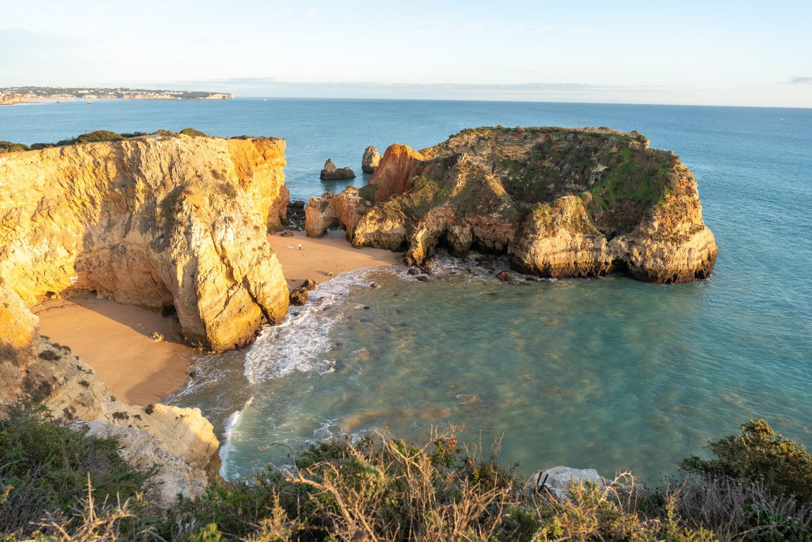 Nur wenige Kilometer weiter findest du die Praia da Marinha, die oft als eine der schönsten Küstenkulissen Europas bezeichnet wird. Markante Felsbögen und türkisfarbenes Wasser machen diesen Abschnitt zu einem Highlight. Ein gut ausgebauter Wanderweg führt entlang der Klippen zwischen den beiden Orten – perfekt, um die Landschaft in Ruhe zu genießen.