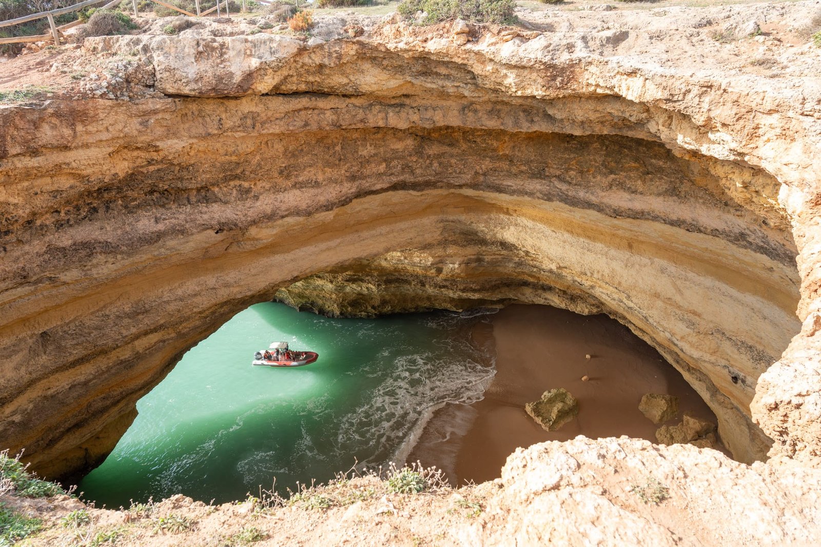 Zwischen Portimão und Albufeira liegen zwei der bekanntesten Orte an der Südküste: die Benagil-Höhlen und die Praia da Marinha. Die Höhlen von Benagil erreichst du nur vom Wasser aus – entweder mit dem Kajak, auf einer geführten Bootstour oder, wenn die Bedingungen passen, schwimmend vom nahen Ufer. Besonders eindrucksvoll ist das große Felsgewölbe mit dem kreisrunden Loch in der Decke, durch das das Sonnenlicht einfällt.