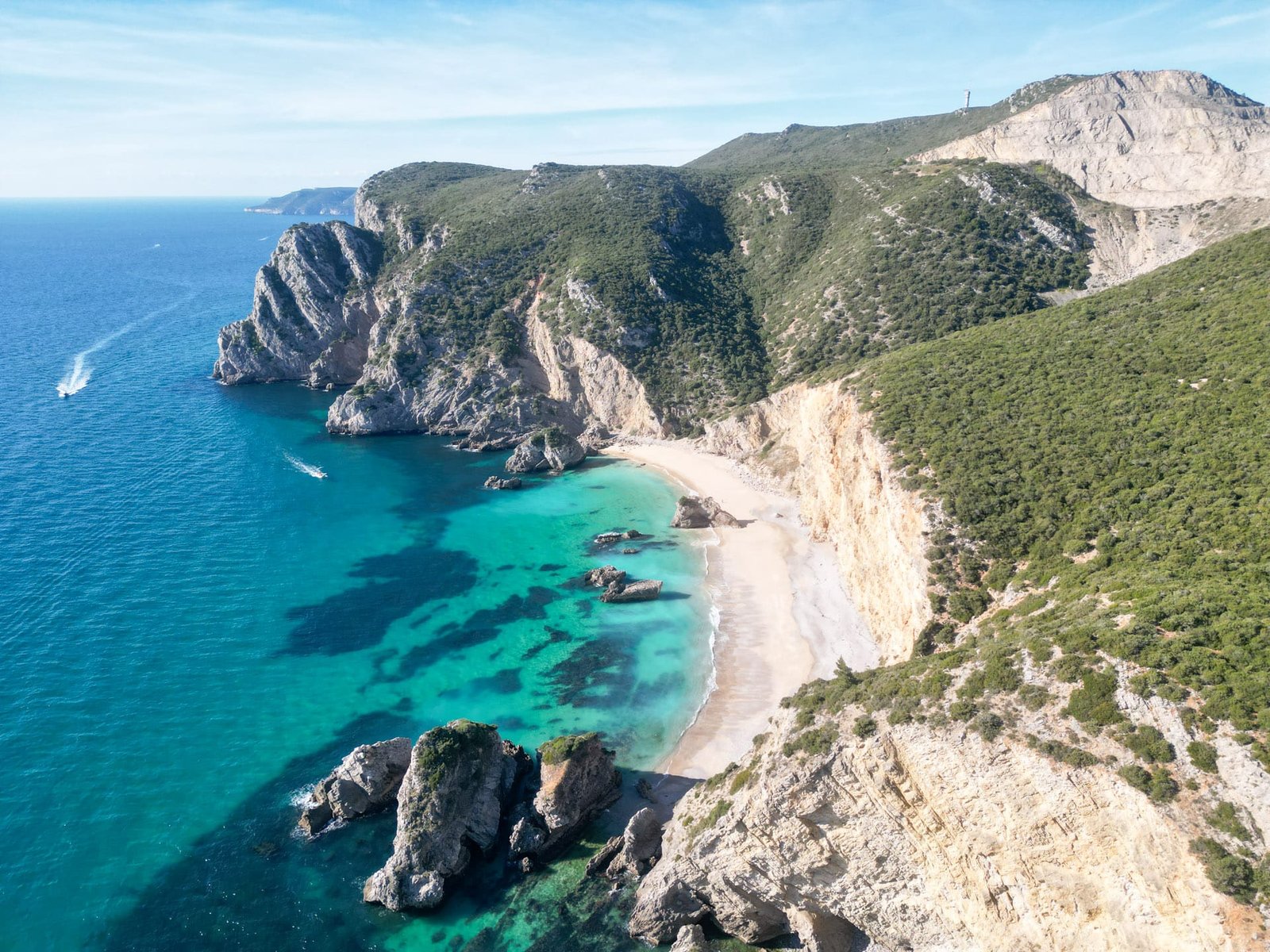 Nur eine knappe Stunde südlich von Lissabon beginnt die Halbinsel Setúbal, die sich hervorragend als erster Stopp auf der Reiseroute eignet. Hier treffen grüne Hügel auf lange Sandstrände, die deutlich ruhiger sind als in der Algarve. Besonders im Naturpark Arrábida findest du kleine Buchten mit türkisblauem Wasser, die fast karibisch wirken.