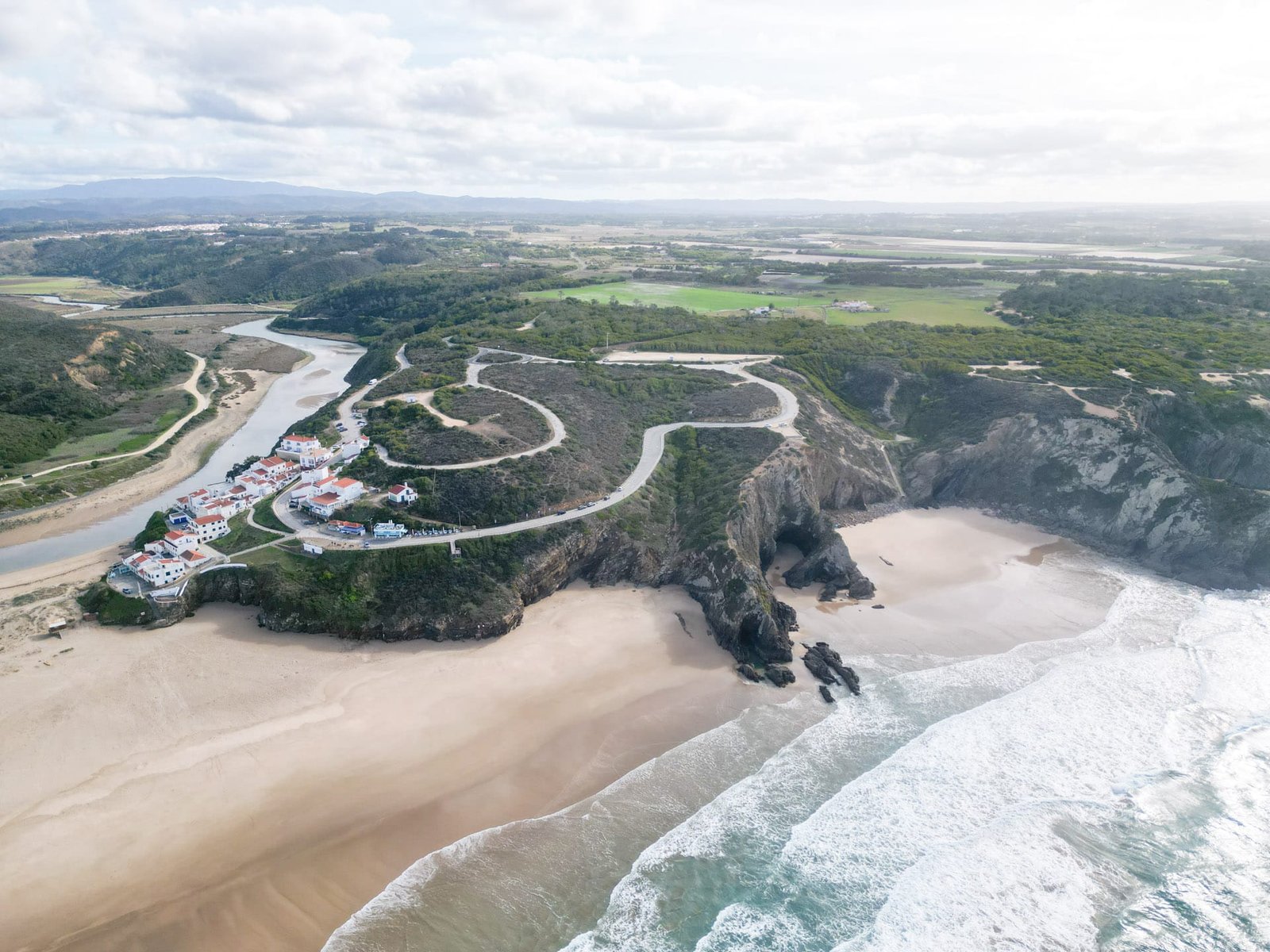 Das kleine Dorf Zambujeira do Mar liegt direkt auf den Klippen und ist einer der charmantesten Orte an der Alentejo-Küste. Unten breitet sich ein breiter Strand aus, der von Felsen eingerahmt ist und sich hervorragend für einen Badestopp eignet. Oben im Ort findest du weiße Häuser, kleine Cafés und Restaurants, die frischen Fisch servieren – typisch portugiesisch und angenehm entspannt.