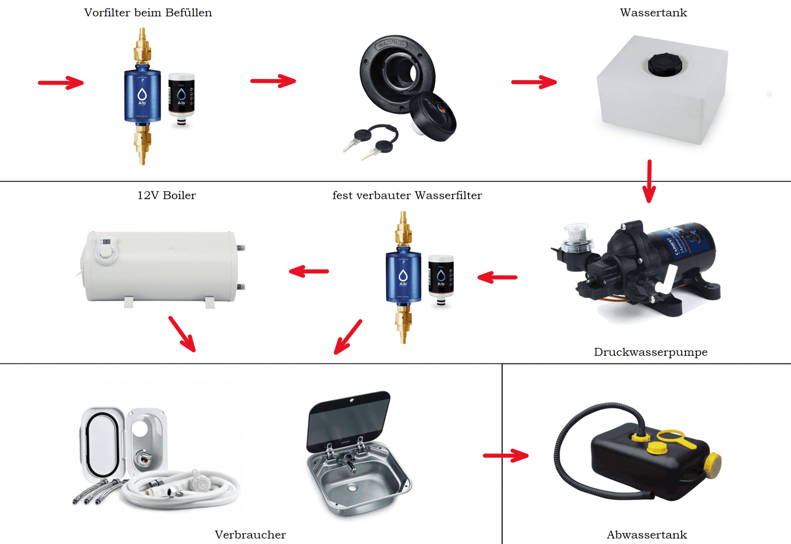 In der folgenden Infografik bekommst du einen groben Überblick über die wichtigsten Komponenten in einem Druckpumpen System. Der Aufbau und Aufwand ist zwar etwas komplizierter als bei einfachen Lösungen mit Tauchpumpen, bietet jedoch einige Vorteile und mehr Komfort. Insbesondere wenn das Wasser im Camper trinkbar sein soll und Wasserfilter zum Einsatz kommen sollen, führt kein Weg an Druckwasserpumpen vorbei.